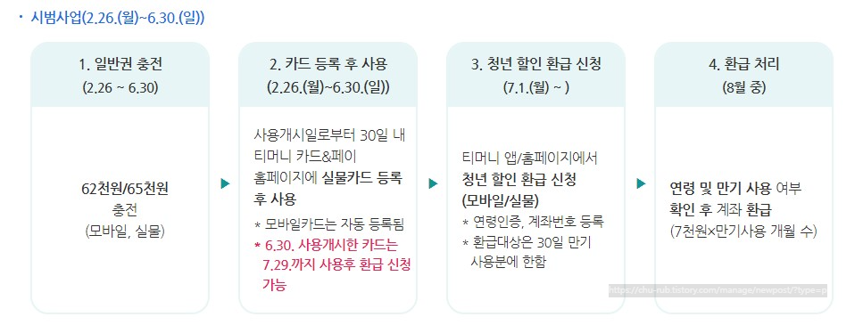 일반권 충전 > 카드 등록 후 사용 > 청년 할인 환급 신청 > 환급 처리