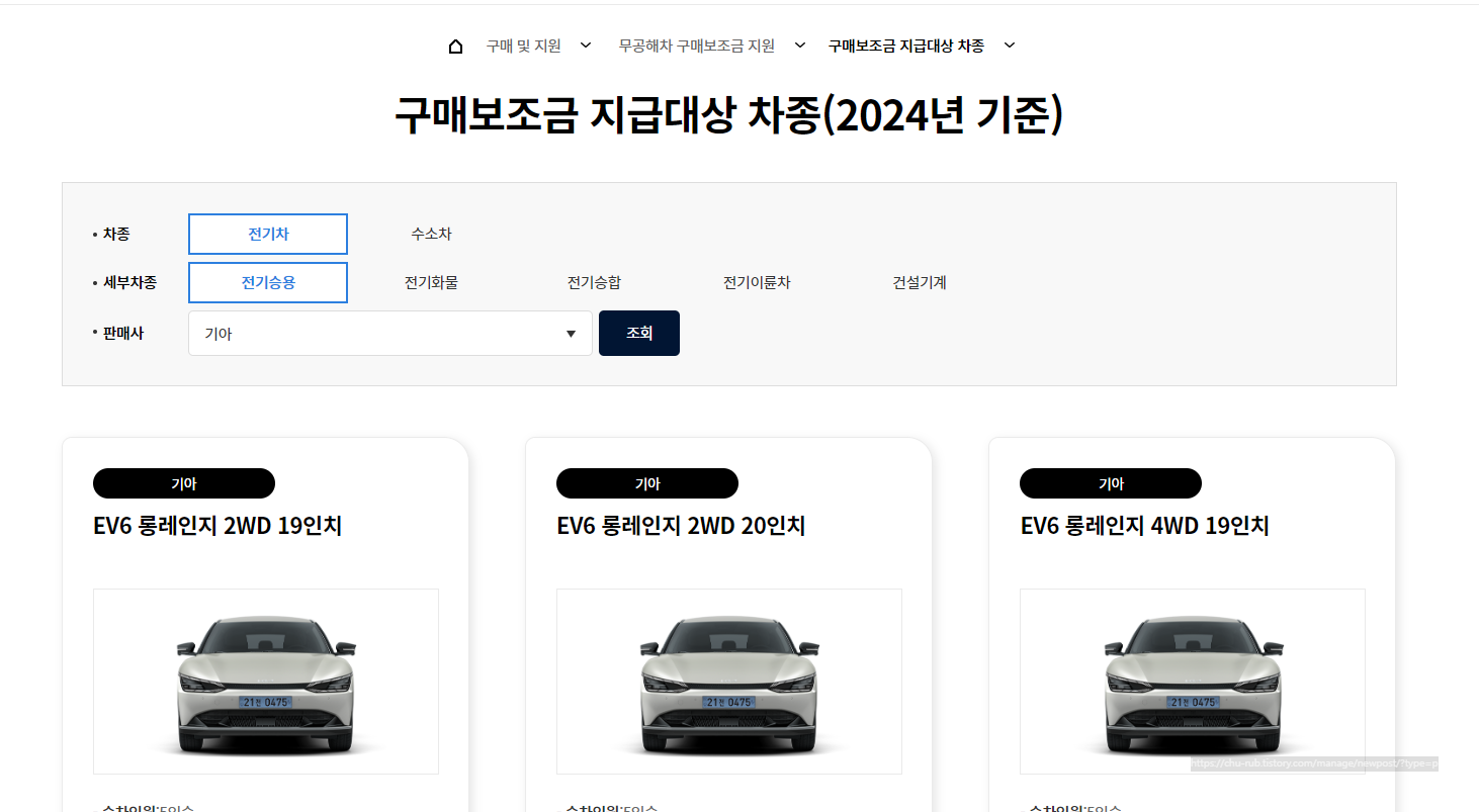 전기차 구매보조금 지급대상 차종 조회하기 2024년 기준