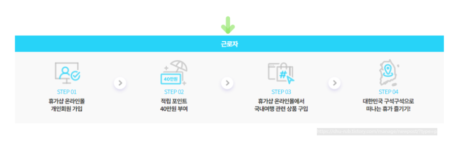 근로자 휴가지원사업이란 기업에서 신청하고 직원들에게 돌아가는 복지 같은 건데요. 기업과 나라에서 지원금을 지원하고 기업은 나라에서 주는 혜택을 추가로 받을 수 있어서 기업 과 직원이 모두 좋은 제도 입니다.