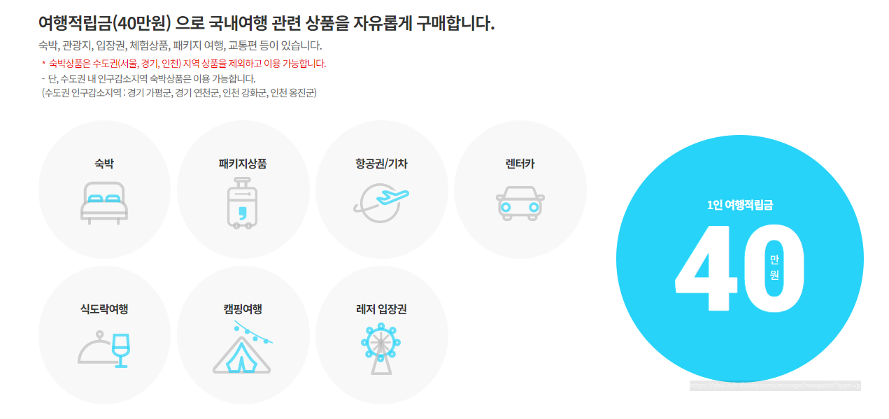 여행적립금(40만원) 으로 국내여행 관련 상품을 자유롭게 구매가능 합니다.