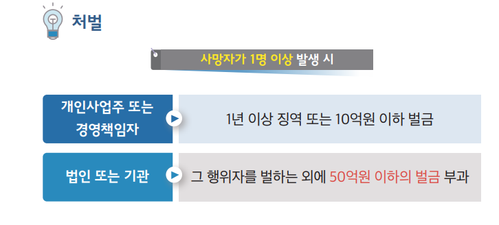 개인사업주 또는 경영책임자 등이 고의 또는 중대한 과실로 안전 및 보건 확보의무를 위반하여 중대재해를 발생하게 한 경우 개인사업주나 법인, 기관은 손해를 입은 사람에게 손해액의 5배 내에서 배상책임을 집니다.