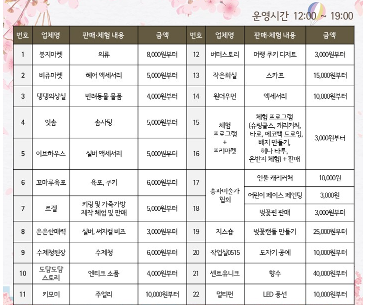 아이들을 위한 키링 만들기, 타로체험, 벚꽃캔들 만들기, 캐리커처, 페이스 페인팅 등
