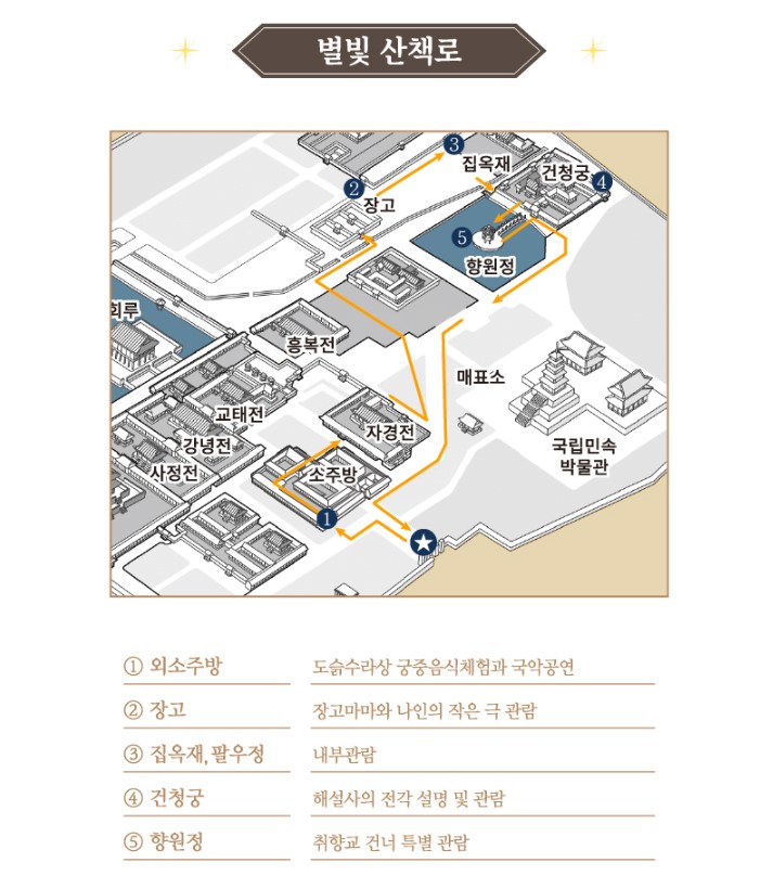 은은한 별빛 아래 경복궁 소주방에서 국악공연을 즐기며 수라상을 맛보고 전문해설사와 함께 경복궁 북측권역으로 떠나 볼 수 있는 별빛야행 시작합니다.
