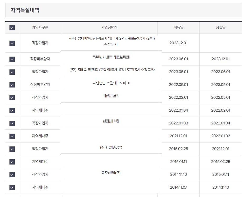 이렇게 내가 취득한일, 상실한일이 자세하게 기록되어있습니다.