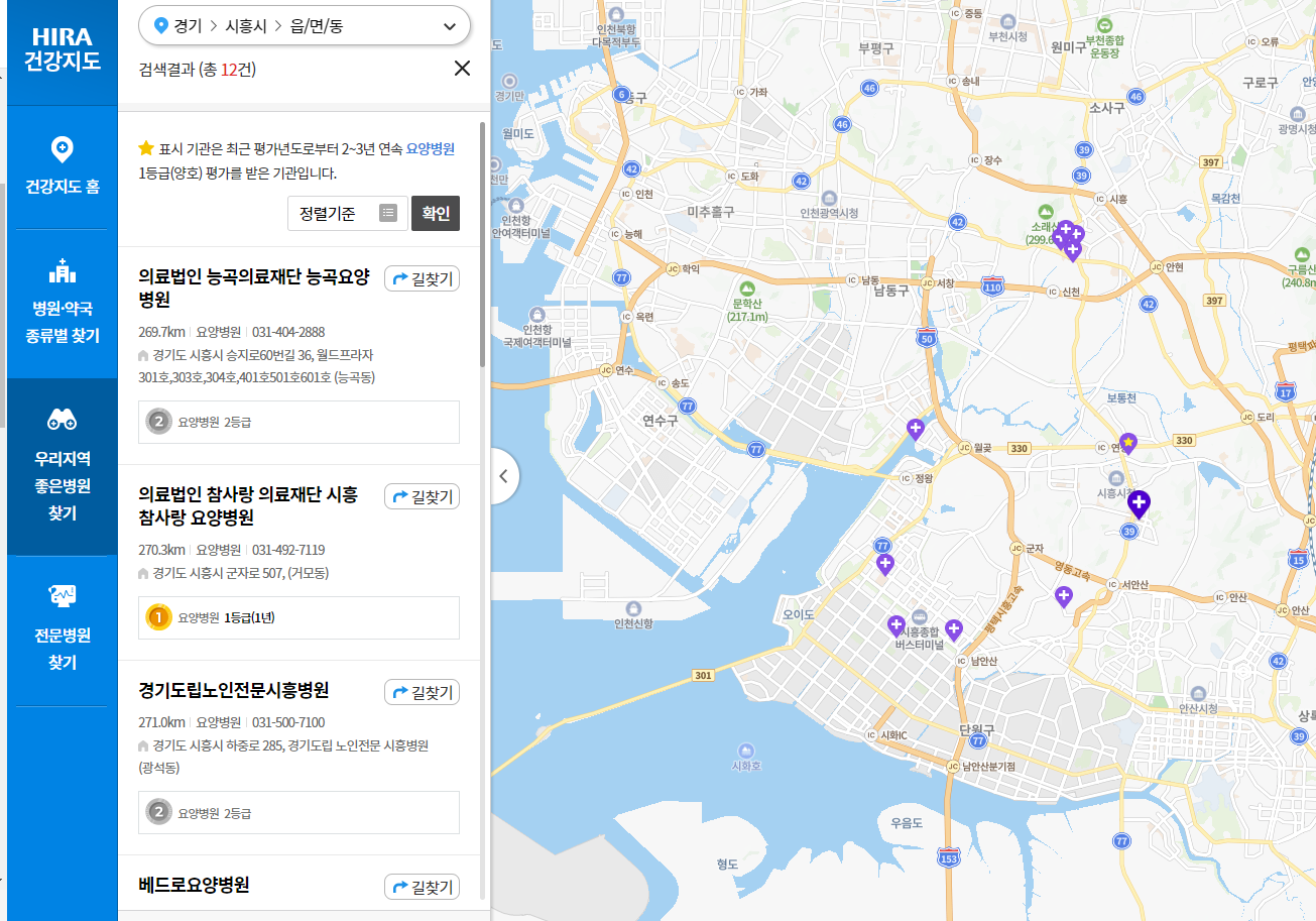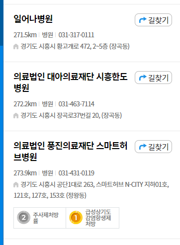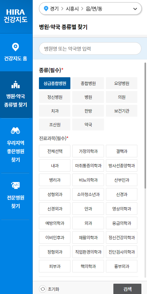 좌측 탭을 이용해서 병원과 약국을 종류별로 검색 가능하고, 전문병원까지 찾기가 가능합니다.