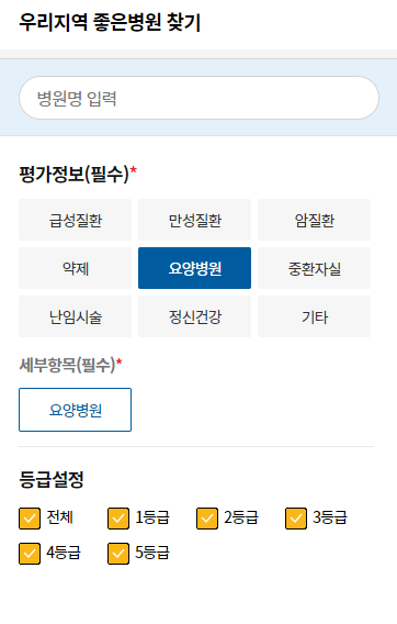 급성질환, 만성질환, 요양병원 등 선택합니다.