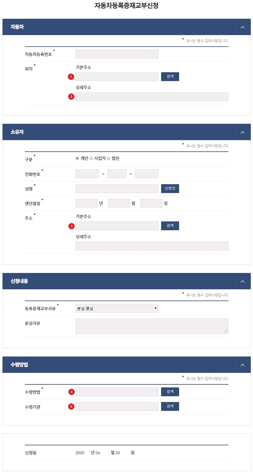 자동차 등록증 재발급 신청은 자동차 소유자만 신청 가능합니다.