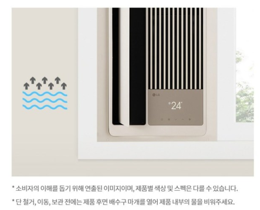 에어컨 특성상 물이 생기기 마련인데, 이 제품은 수분을 자체 증발 시켜주니까 물빠짐을 위함 통이 필요 없어서 편리하게 사용할 수 있습니다.