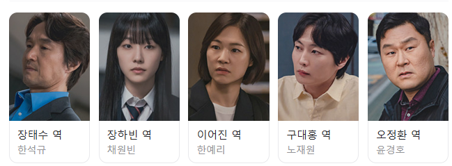 - 장하빈: 장태수의 딸로, 아버지와의 관계에서 갈등을 느끼고 반항적인 모습을 보입니다.