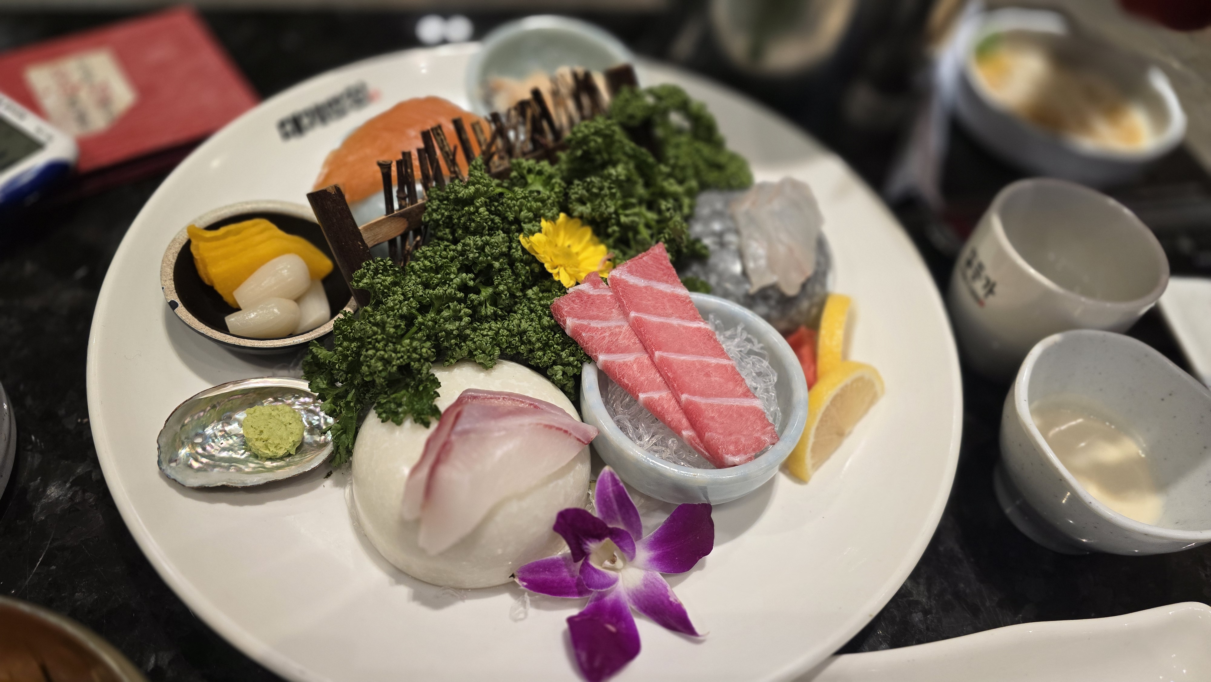 자리에 앉자마자 풍성하게 차려진 기본 상차림에 감탄했습니다. 신선한 회, 시원한 물회, 샐러드 등 10가지가 넘는 해산물 요리가 눈과 입을 즐겁게 했습니다. 특히 입안에서 사르르 녹는 참치회와 쫄깃한 식감이 일품인 도미회는 정말 훌륭했습니다. 겨울에 맛보는 물회 또한 색다른 즐거움이었습니다.