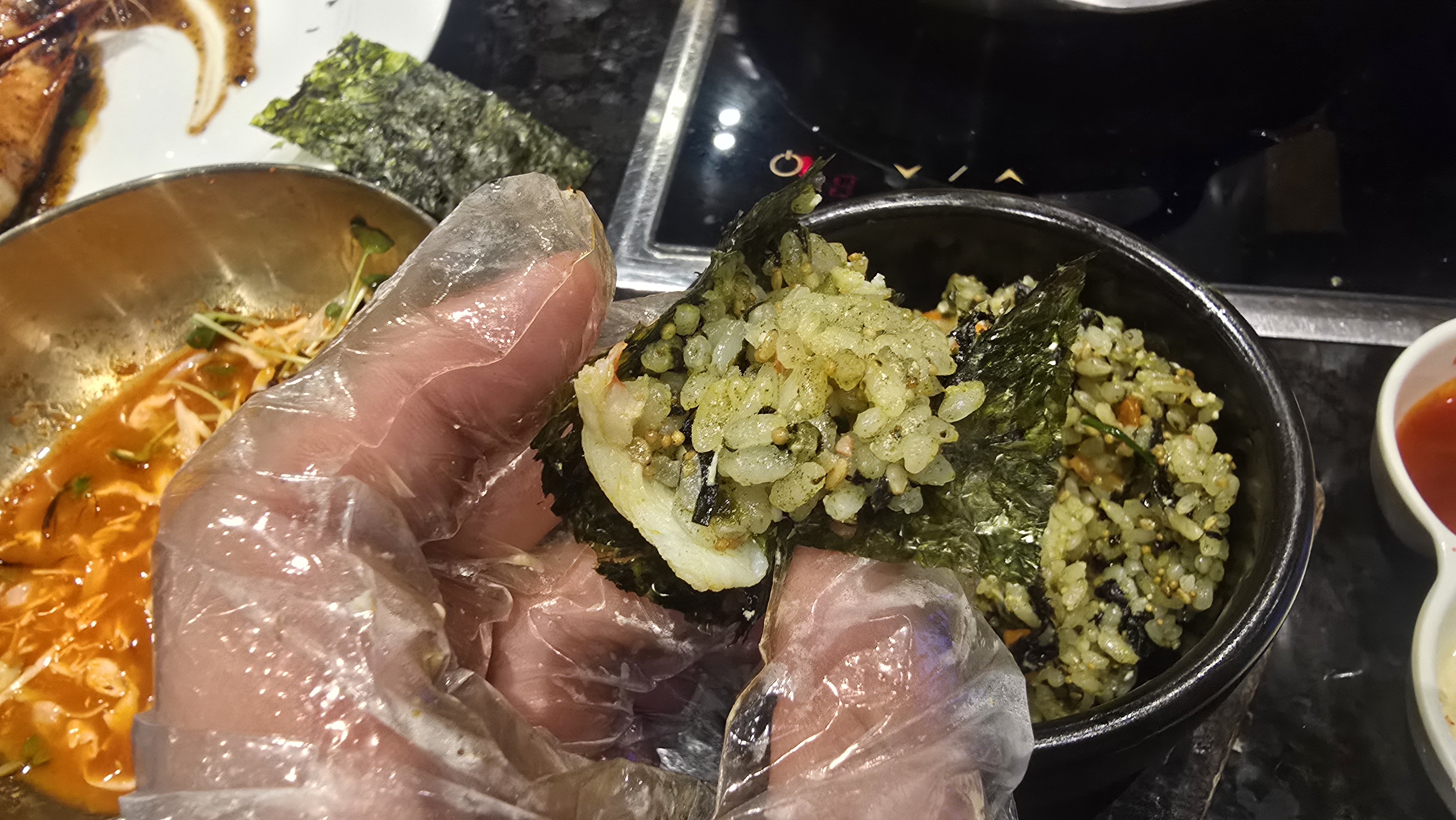 대게와 랍스터 외에도 블랙타이거 새우, 알밥, 구수한 된장찌개 등 다양한 곁들임 메뉴가 코스의 풍성함을 더했습니다. 특히 이국적인 풍미가 느껴지는 블랙타이거 새우는 잊을 수 없는 맛이었습니다.