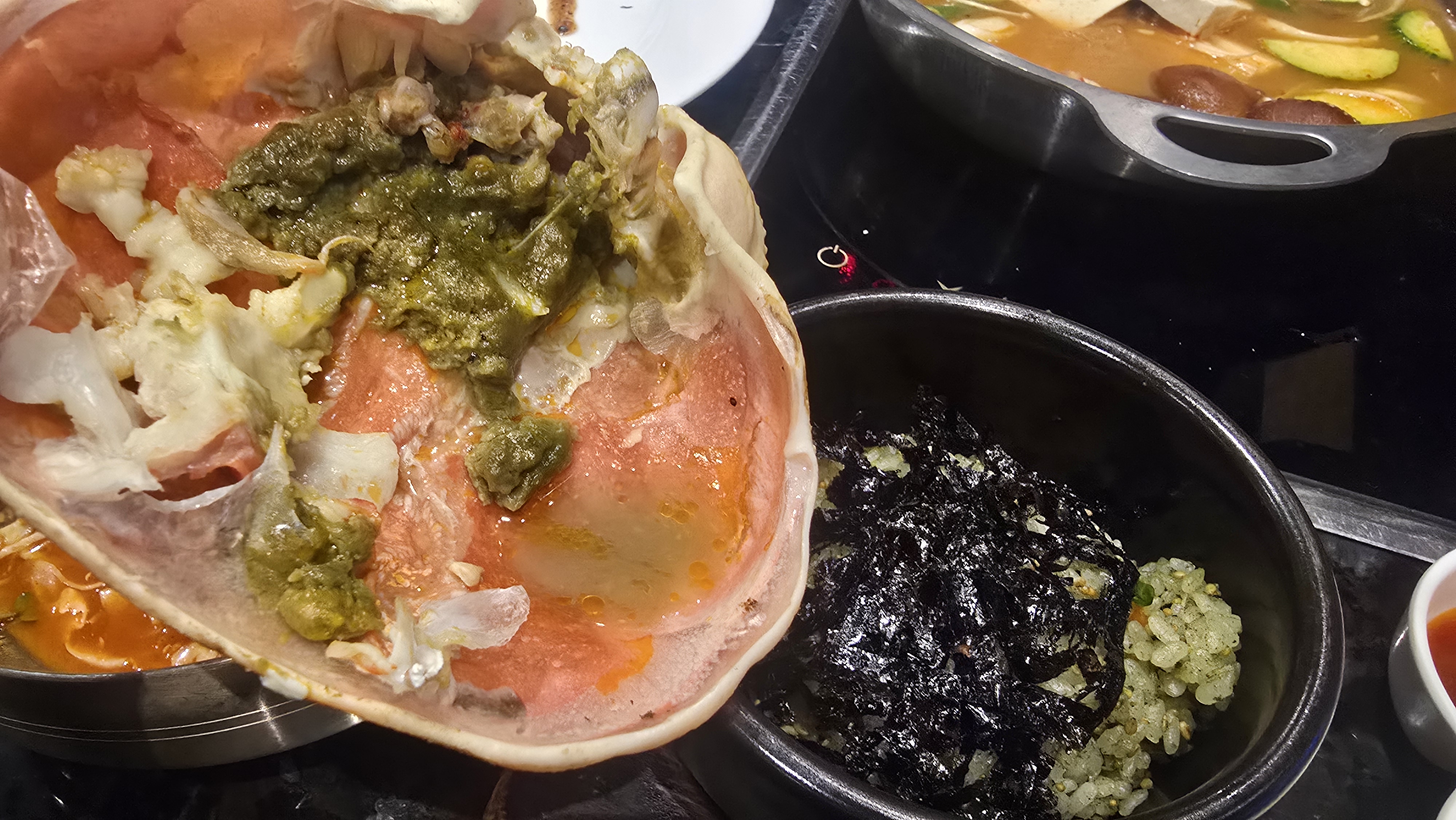 고소한 알밥에 대게 내장을 듬뿍 넣어 비빈 후 김에 싸 먹으니 정말 꿀맛이었습니다. 따뜻한 된장찌개는 식사의 마무리를 깔끔하게 해 주었습니다.