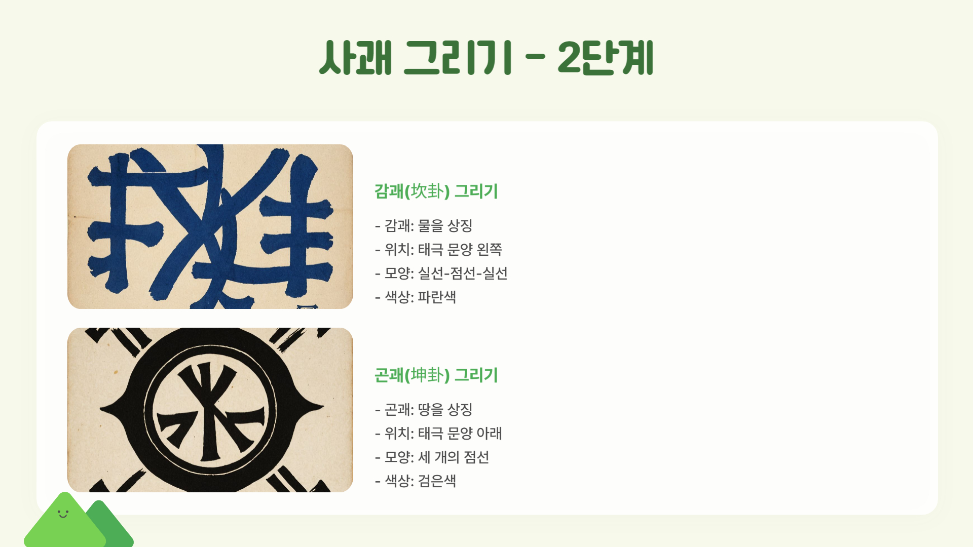 - 왼쪽 하단(리괘): 짧은 선, 긴 선, 짧은 선 순서로 그립니다.