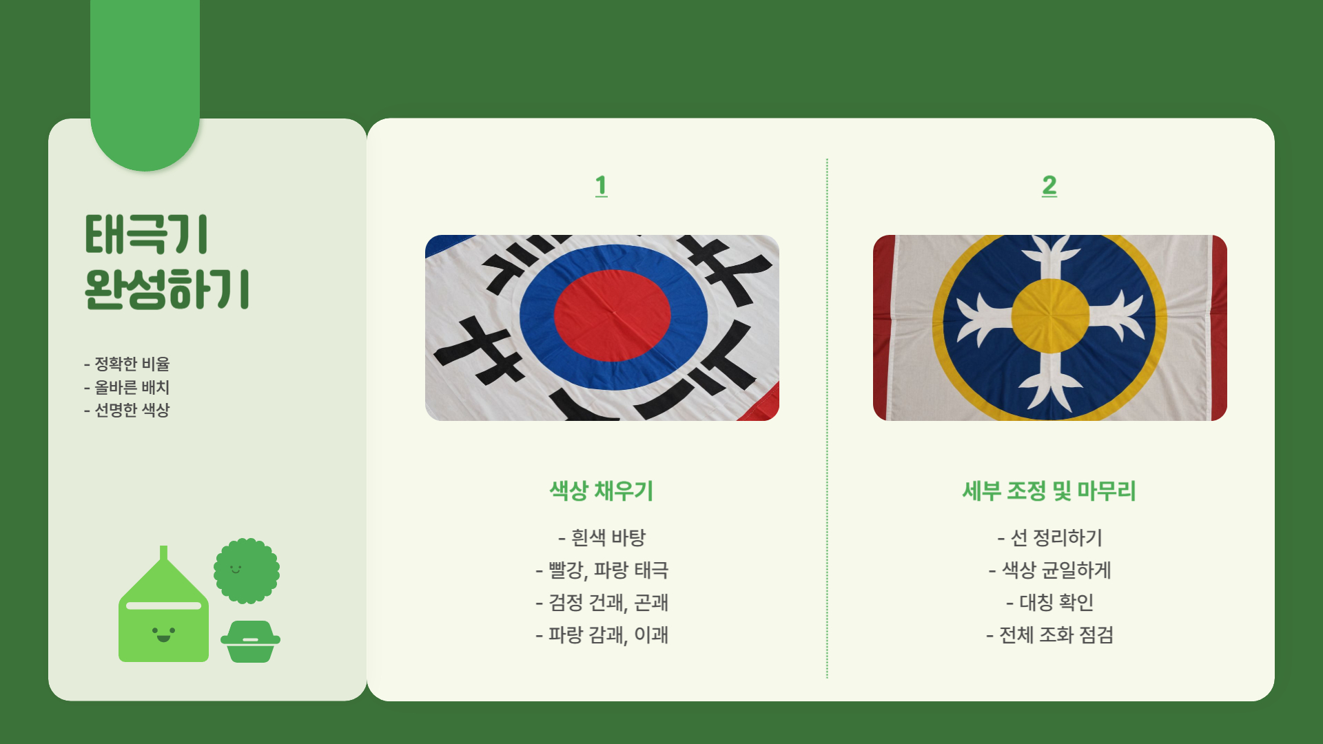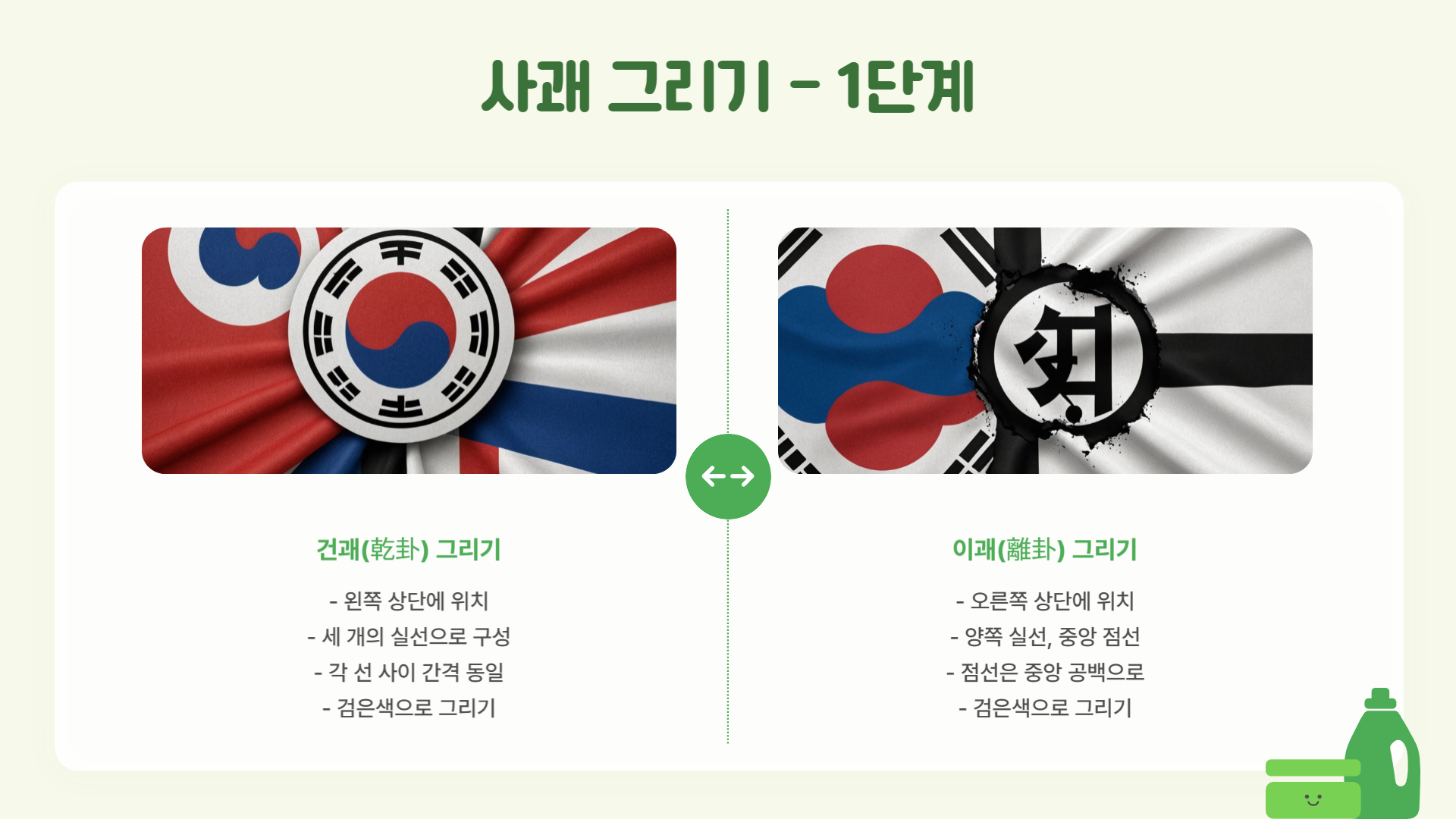 - S자 활용법: 태극 문양을 그릴 때, 알파벳 'S'를 그린 후 이를 기준으로 윗부분을 빨간색, 아랫부분을 파란색으로 채우면 쉽게 그릴 수 있습니다.