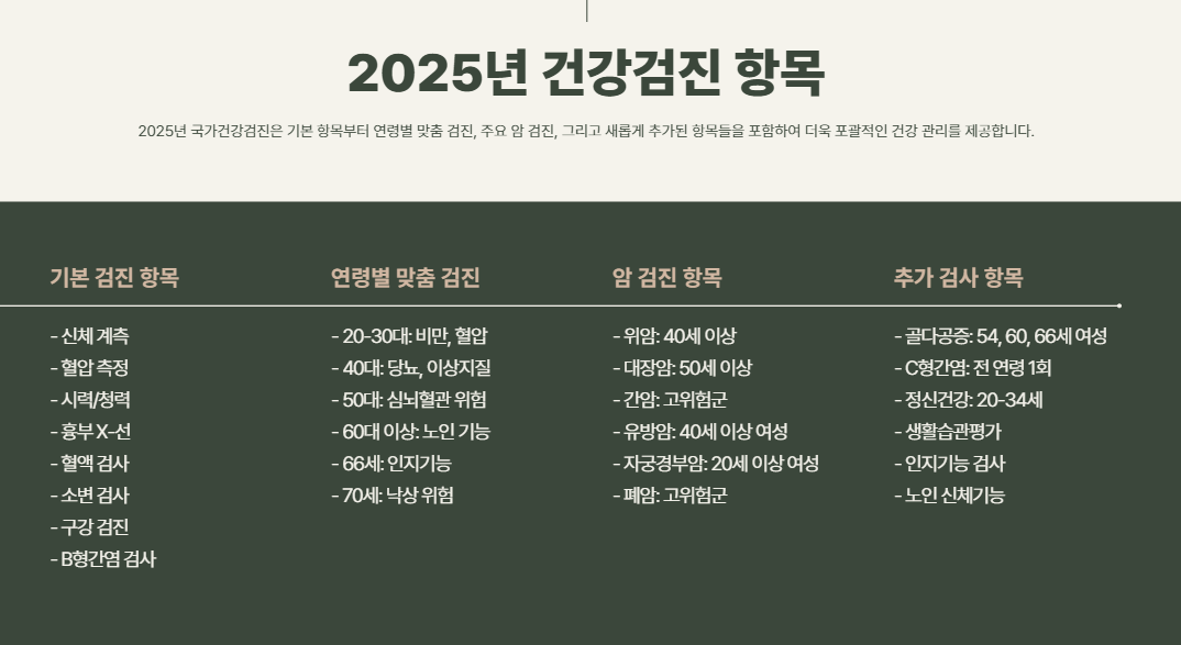 - 암 검진 항목(연령별 다름): 위암, 대장암, 간암, 유방암, 자궁경부암 등