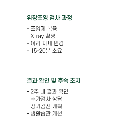 - 조영제를 통한 윤곽 촬영으로, 내시경이 불가능한 경우 대체 가능