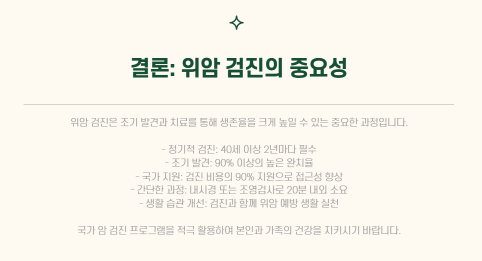 위암은 우리가 흔히 접하는 질병이지만, 조기발견을 통해 완치 가능한 암 중 하나입니다. 2025년 위암 검진 대상자에 해당된다면 검진 시기를 놓치지 말고, 본인과 가족의 건강을 위한 중요한 선택으로 삼아야 합니다. 단순한 건강검진이 아니라, 생명을 지키는 기회라는 점을 기억하세요.
