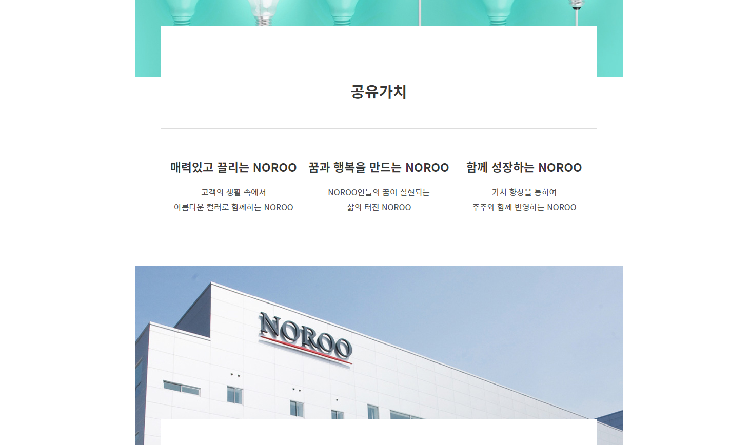 "노루홀딩스"는 사업지주 회사로서 NOROO 그룹의 위상을 정립하면서 자회사의 수익을 극대화하기 위한 정책 및 전략을 개발하고, 경영 효율성의 제고와 책임 경영 체제를 확립해 나가고 있습니다. 또한 세계시장의 정보 공유를 통하여 자회사간 시너지 효과를 극대화하도록 하고, 미래 유망한 신수종 사업을 개발하는 업무를 수행하고 있습니다. "노루코일코팅"은 각종 건자재 및 가전제품에 필요한 컬러 강판용 페인트를 생산하고 있는 코일코팅 전문 회사입니다. 국내 최초의 코일 코팅용 페인트를 제조·공급하고 지속적인 기술 개발 및 투자, 품질 향상, 기술제휴 등을 통해 KS 인증, ISO 9001 인증을 획득하였으며 국내 최초 초고속 코팅용 페인트 공급, 유기피복제 공급 등 최고의 제품을 생산하고 있습니다. "노루케미칼"은 1998년 연 생산 5만 톤 규모의 페인트 신공장과 2002년 5월 연 생산 1만 4천 톤 규모의 수지공장을 준공하여 다양하고 우수한 품질의 페인트 제품을 생산하고 있습니다. 현재 KSM-6020 유성페인트 2종을 비롯하여 14종의 KS제품, 건축용, 목공용, 공업용, 중방식용 및 UPR 등의 제품을 시장에 공급하고 있습니다. "노루로지넷"은 노루페인트의 물류 전반을 총괄 담당하는 회사로써 동종업계 최초로 인터넷을 통한 실질적인 화물공차 정도 및 물류정보 등 효율적인 미래형 물류서비스를 제공하고 있으며, 유통·창고·하역 등 부문별 사업의 통합 운영으로 효율적인 종합 물류서비스 체제를 구축하고 있습니다. "노루오토코팅"은 한국을 대표하는 자동차 제조 기업들에 자동차용 페인트를 공급하고 있는 노루오토코팅은 세계적인 품질의 자동차용 페인트를 개발·생산하는 전문 기업입니다. 2008년, 화성에 최첨단 설비를 갖춘 연구 시설과 대단위 공장 완공으로 글로벌 마켓에 고기능, 고품질의 페인트를 공급하고 있습니다. 이렇게 노루계열사가 모두 회사를 위해 노력을 하고있고 기술력 하나로 페인트 업계 1위를 차지하고 있는 이유중 하나입니다. 미래에는 어떤 친환경 제품이 개발되어 우리 생활에 편리함을 줄지 기대가 되는 부분입니다.
