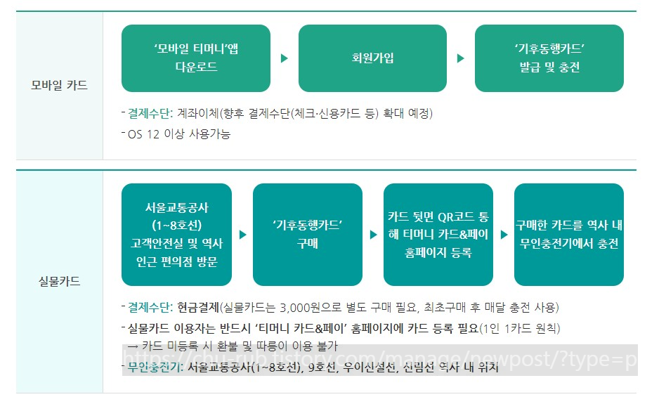 ※ 카드 충전 시 충전일로부터 5일 이내 사용개시일 선택 가능(1월 23일 충전 시 1월 27일부터 사용가능. 30일 후 자동만료.) ※ 실물카드 판매처: 서울교통공사 1~8호선 고객안전실(1호선은 서울역 ~ 청량리역)/ 9호선·우이신설선·신림선 역사 주변 편의점